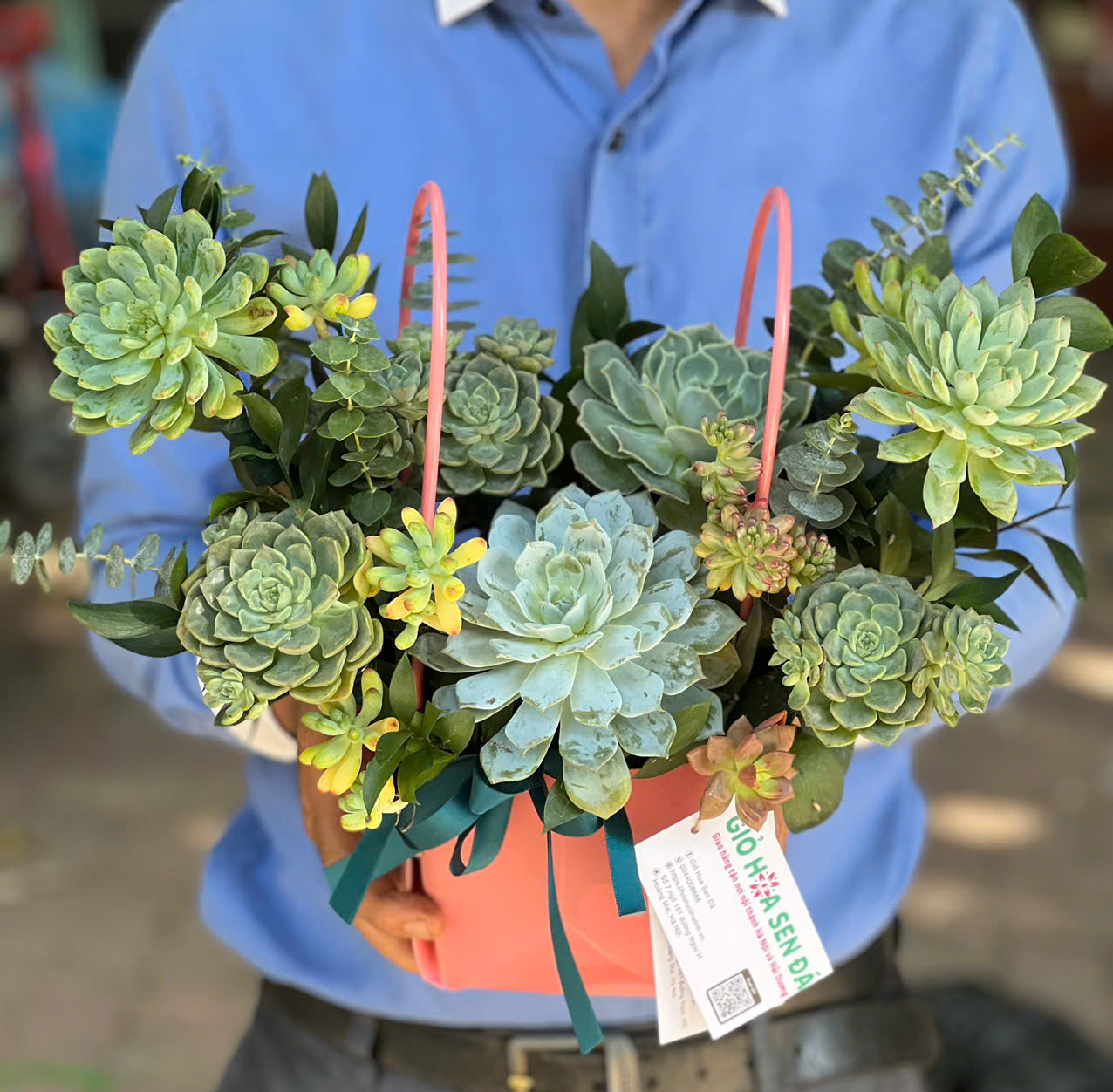 Lẵng hoa sen đá tone xanh lá
